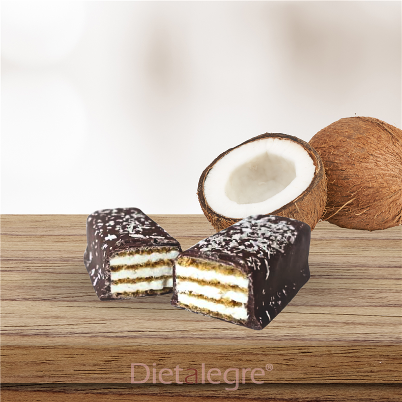 Zloženie: mliečna čokoláda 51 % [kakaové maslo, hydrolyzovaný kolagén, kakaová hmota, polydextróza, fruktooligosacharidy, mliečne bielkoviny, sušené mlieko, odtučnený kakaový prášok, emulgátory (slnečnicový lecitín, polyglycerol-polyricinoleát), sladidlo (sukralóza), antioxidant (α-tokoferol)], kokosová vafľa 48 % [rastlinný tuk (palmový, palmojadrový), mliečne bielkoviny, hydrolyzovaný kolagén, pšeničná múka, strúhaný kokos (5 %), inulín, emulgátor (sójový lecitín), zahusťovadlo (guma guar), pšeničný škrob, rastlinný olej (kokosový), kypriaca látka (hydrogénuhličitan sodný), aróma, sladidlo (sukralóza), soľ, farbivo E160b (annatto)]. Poleva: strúhaný kokos.